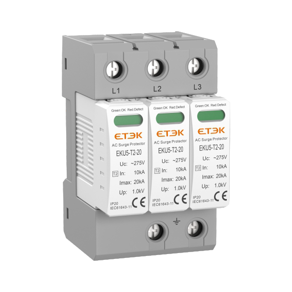 EKU5-T2適用于交流50/60Hz,額定電壓為單相 230V/三相400V的配電和控制系統,滿足電涌保護器(SPD)II級試驗,用于抑制瞬態過電壓低于設備耐沖擊過電壓,泄放電涌能量,從而保護系統電路及設備。